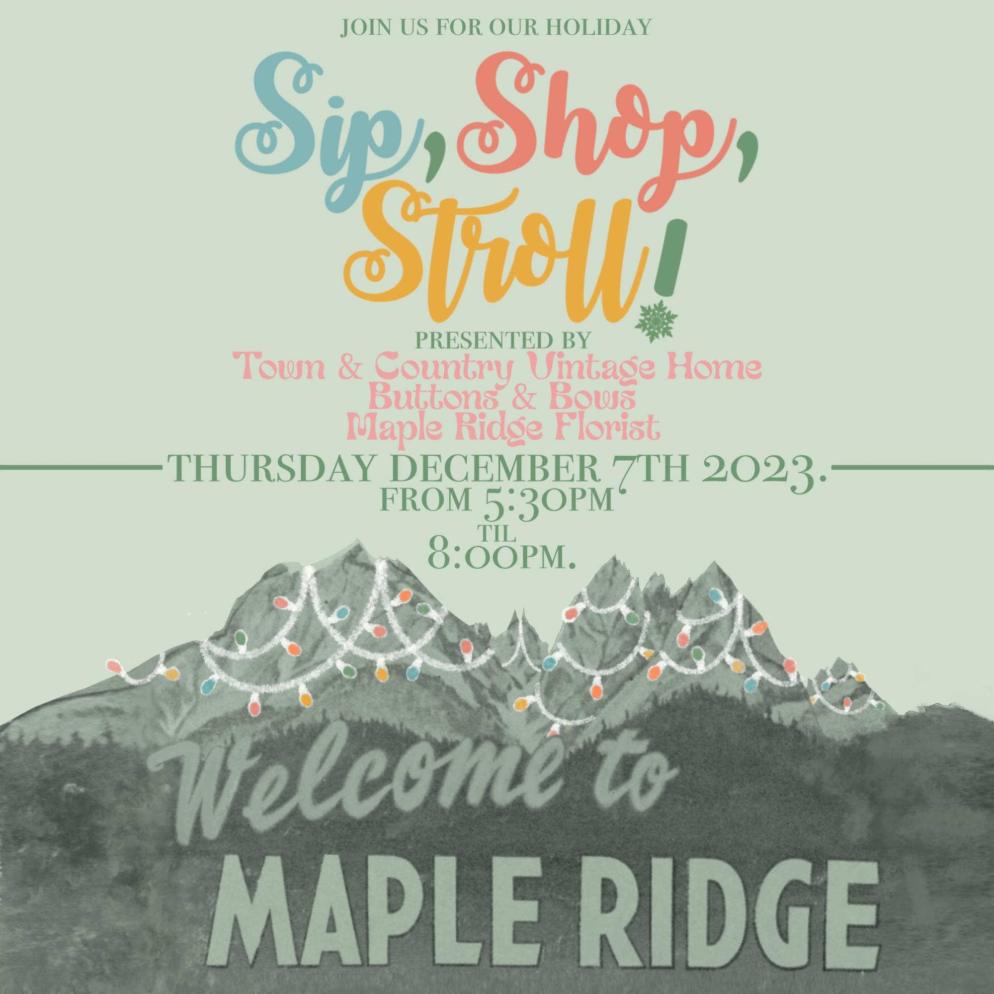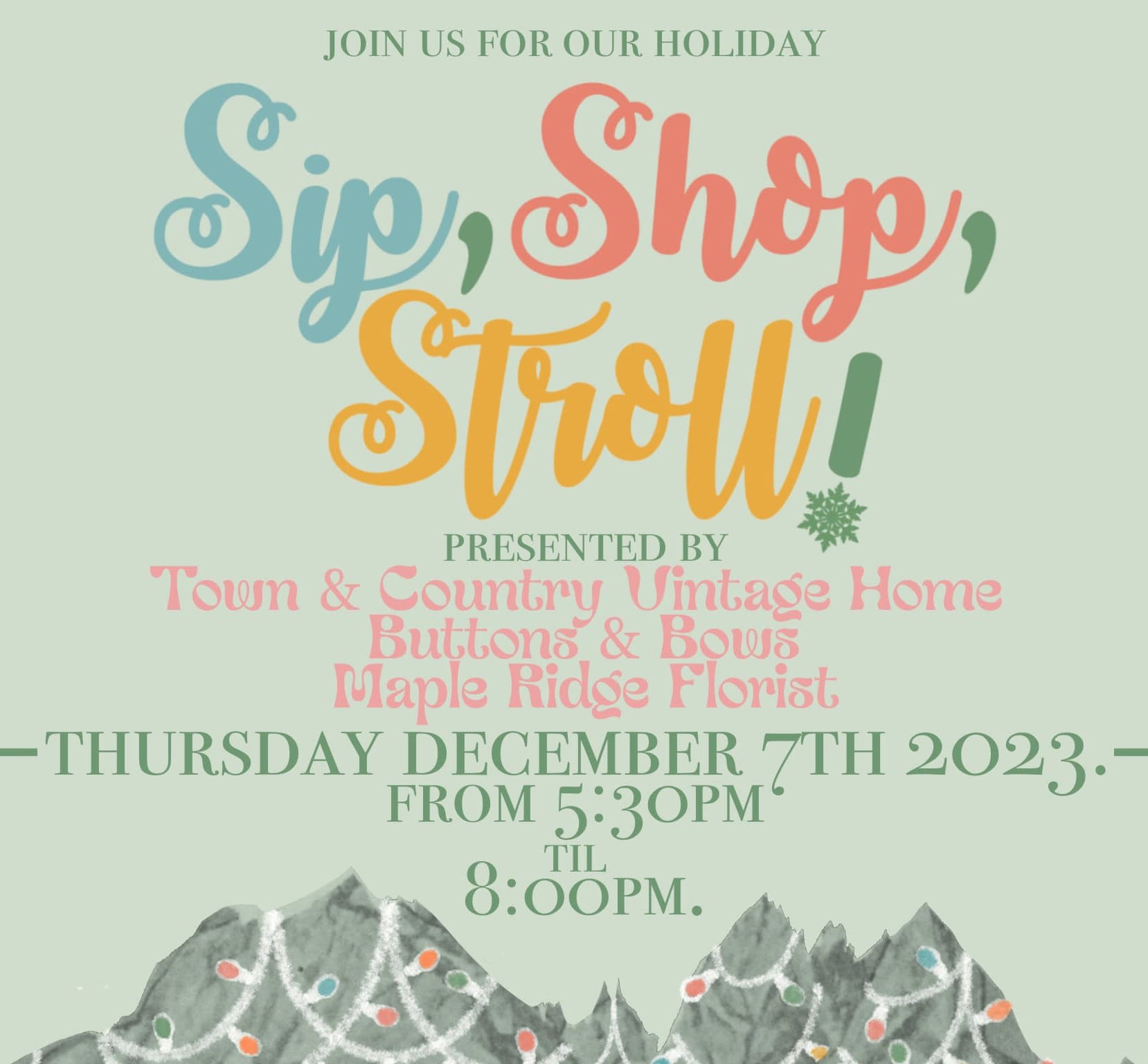 Our annual Sip, Shop, Stroll! is back (First one since Covid). Come enjoy a fun evening with Town and Country Vintage Home, Buttons and Bows and Maple Ridge Florist on Thursday, December 7th from 5:30- 8pm. Come walk and shop to these local businesses as you enjoy some refreshments and tons of Christmas Spirit. Each store will be having a few fun things in store for you. Get a stamp from each shop to be entered into a fabulous giveaway while supporting local.