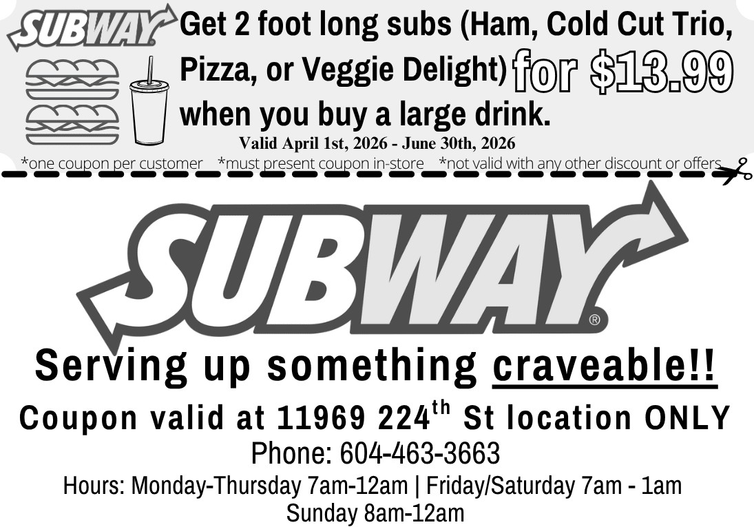 Get 2 foot long subs (Ham, Cold Cut Trio, Pizza or Veggie Delight) For $13.99 when you buy a large drink.
