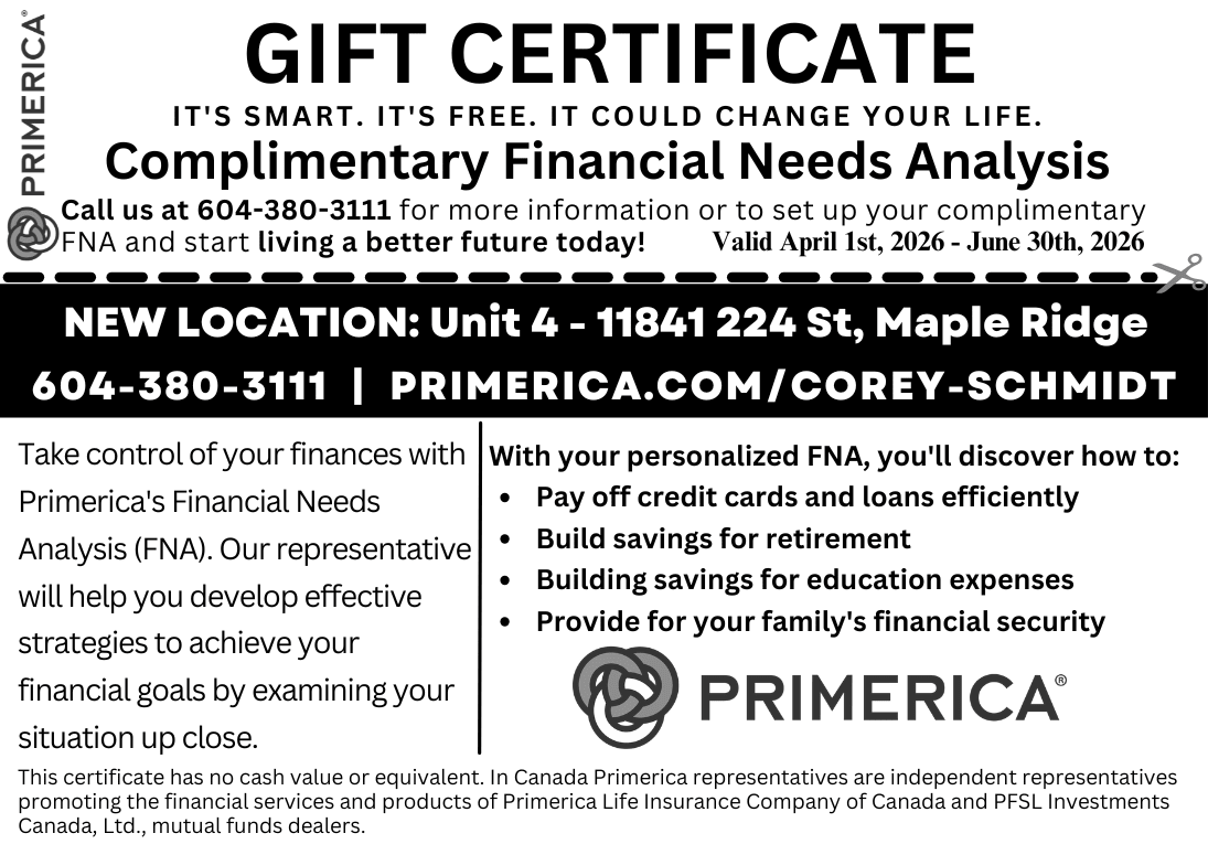 Gift Certificate: Complimentary Financial Needs Analysis.