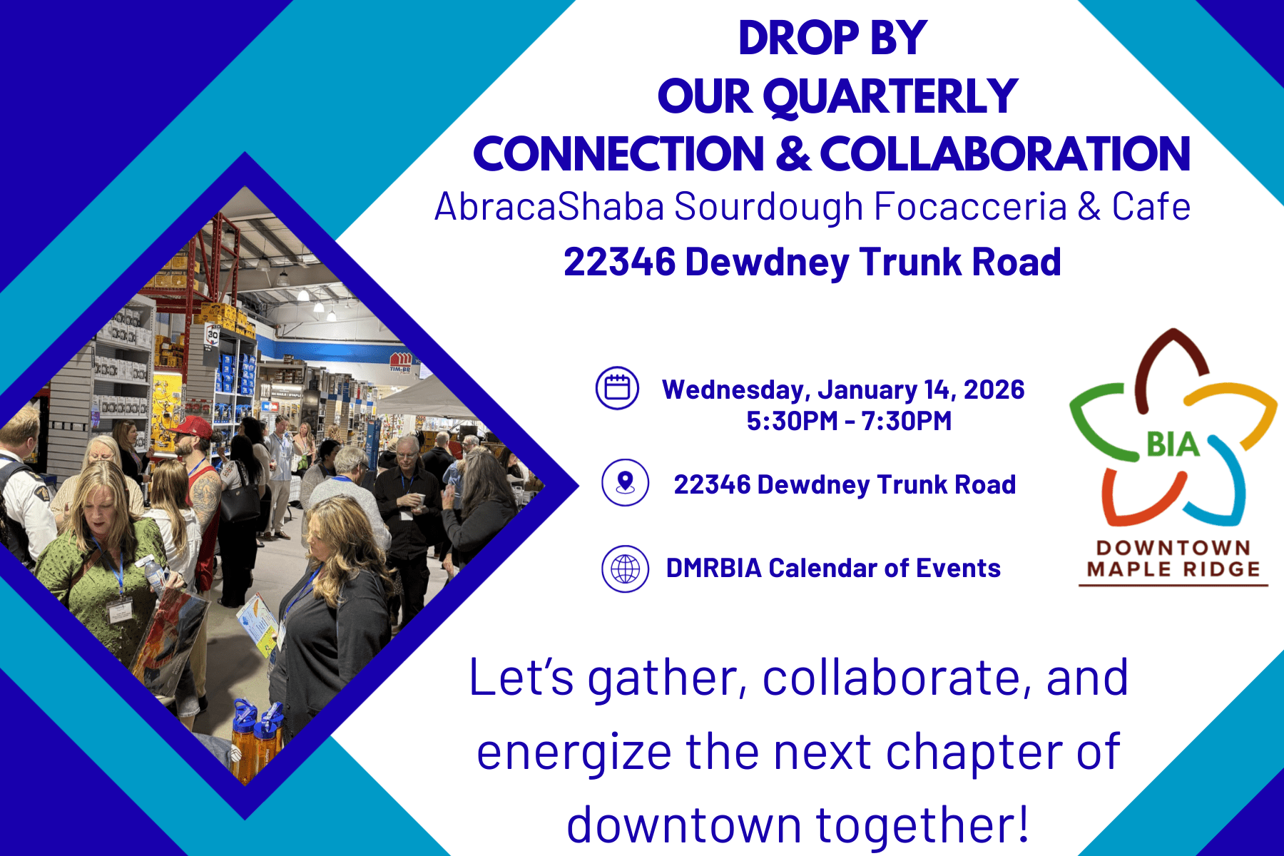 Enjoy a relaxed atmosphere, meaningful conversations, and the chance to win our business card prize draw. Together, we can continue to keep Downtown Maple Ridge vibrant, thriving, and full of possibility.