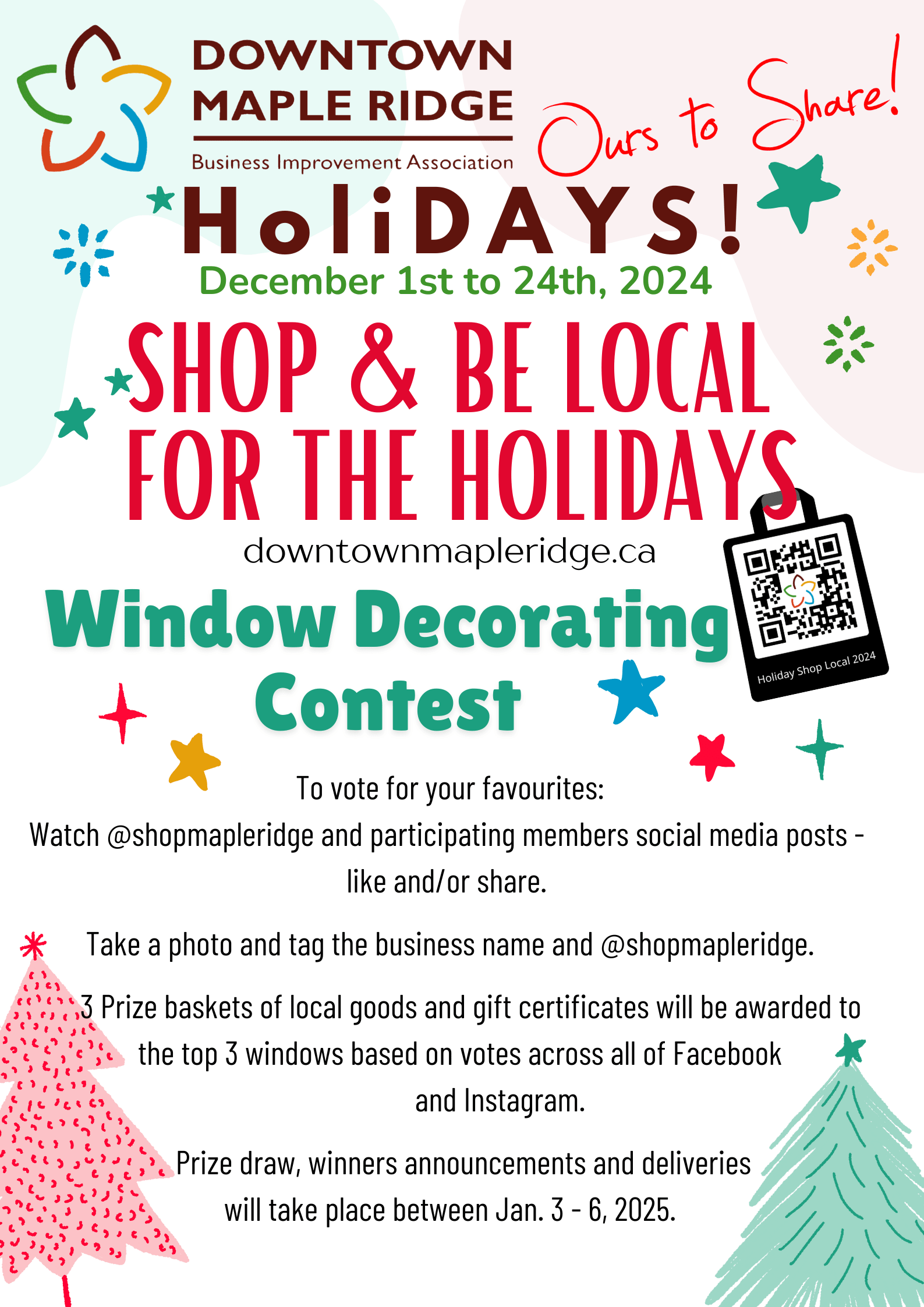 3 Prize baskets of local goods and gift certificates will be awarded to the top 3 windows based on votes across all of Facebook and Instagram. Prize draw, winners announcements and deliveries will take place between Jan. 3 - 6, 2025.