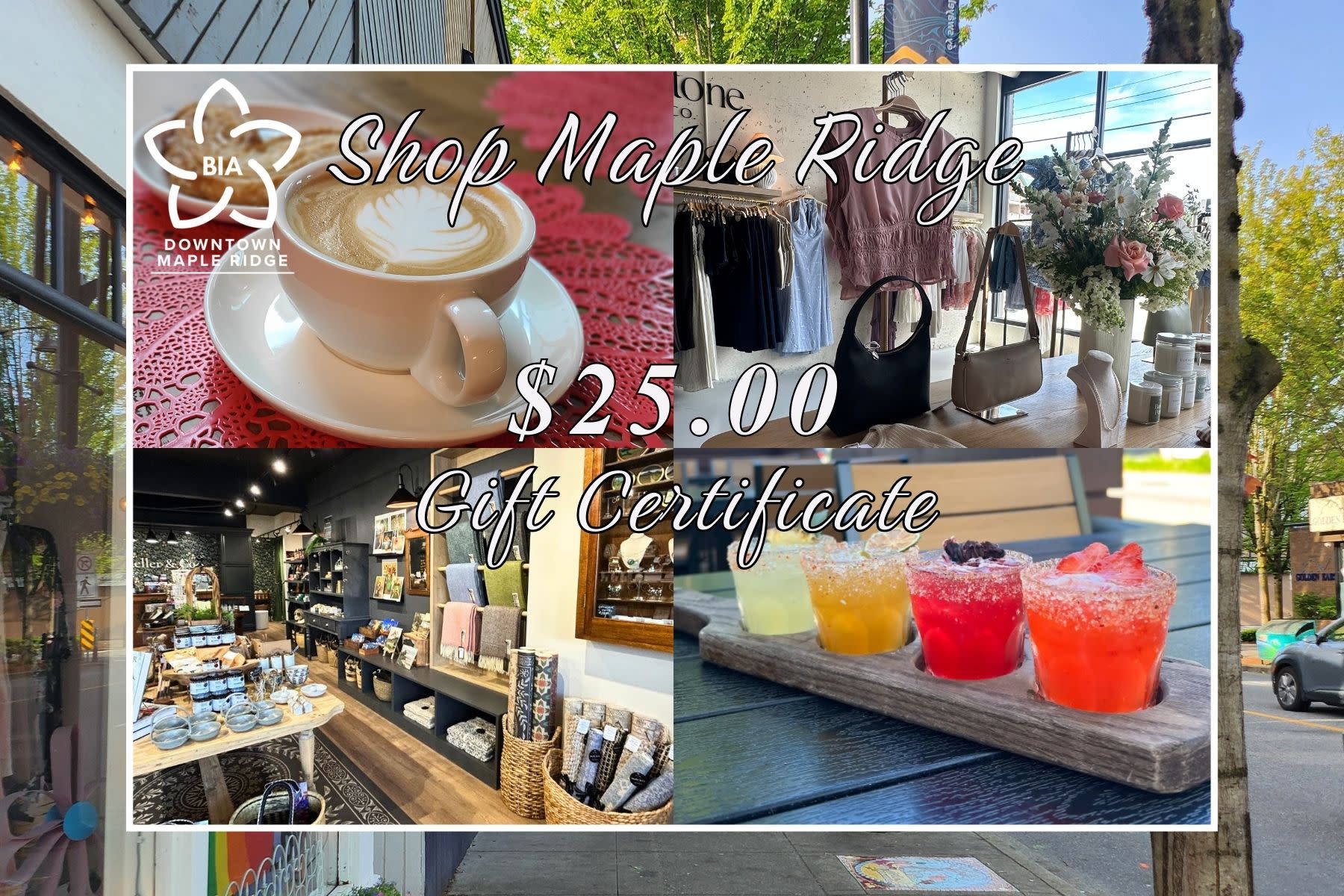 DMRBIA $25 Gift Certificate Valid at participating Downtown Maple Ridge Businesses - listed on the website under Members/Directory or News/DMRBIA Gift Certificate.